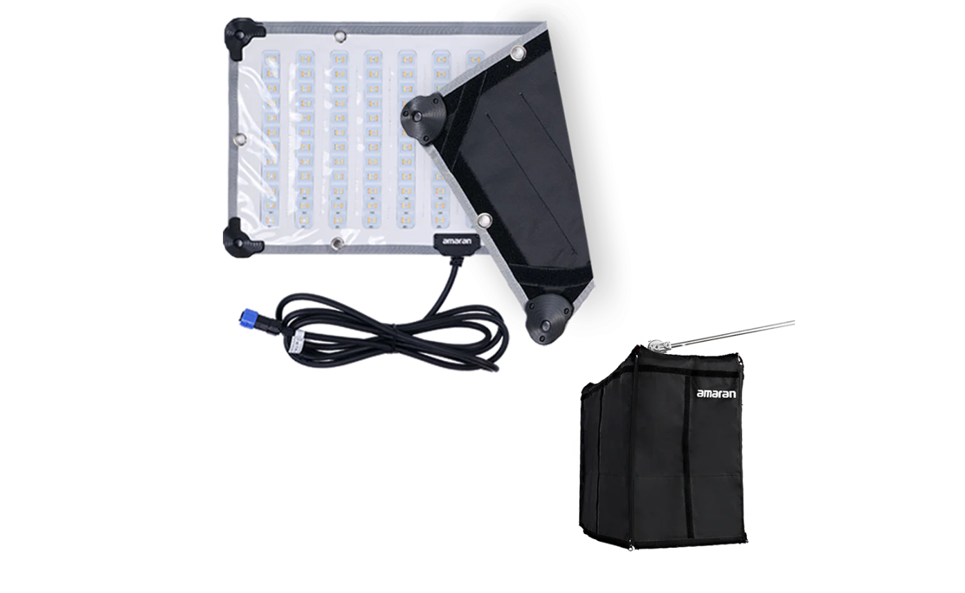To add a beautifully controlled soft light to your scene, attach the included softbox, one of two strengths of diffusion cloths, or the included light control grid using the integrated hook-and-loop fabric to further finesse your lighting design. The F21x can also be combined with the amaran F21 Lantern with light control skirt to extend the fixture as a volumetric lantern or pancake light.