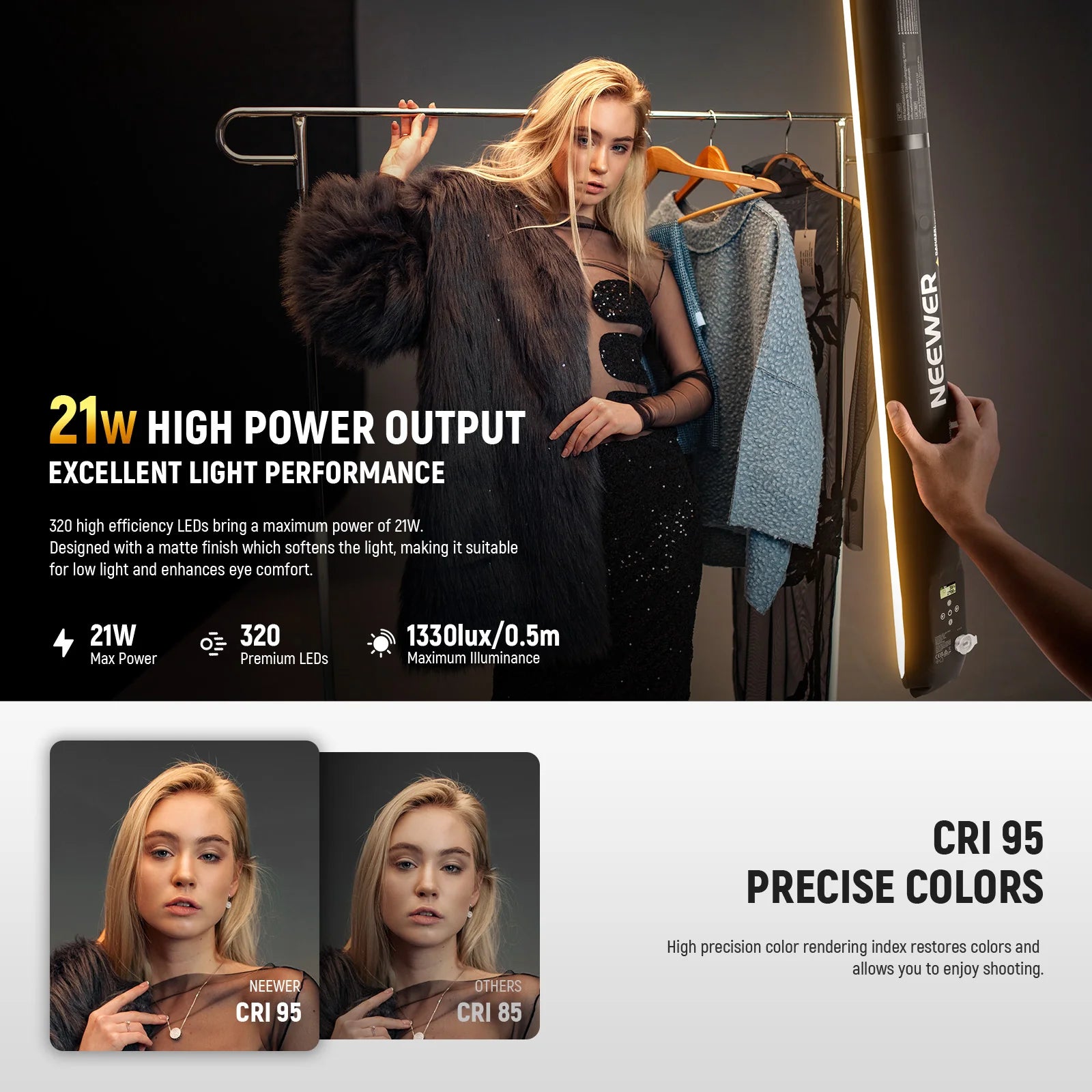 - 21W High Power Bi Color Mobile Fill Light- The built in 320pcs LEDs emit up to 1300LUX/0.5m illumination of 21W powerful output, offering bi color temperature switched across 2700K-6500K for warm and cold tones, along with 0%-100% adjustable brightness to adapt to different lighting conditions from dim to bright. The high CRI rating of 95 ensures color accuracy, faithfully reproducing the true beauty of the subjects as content creator essential and influencer must have