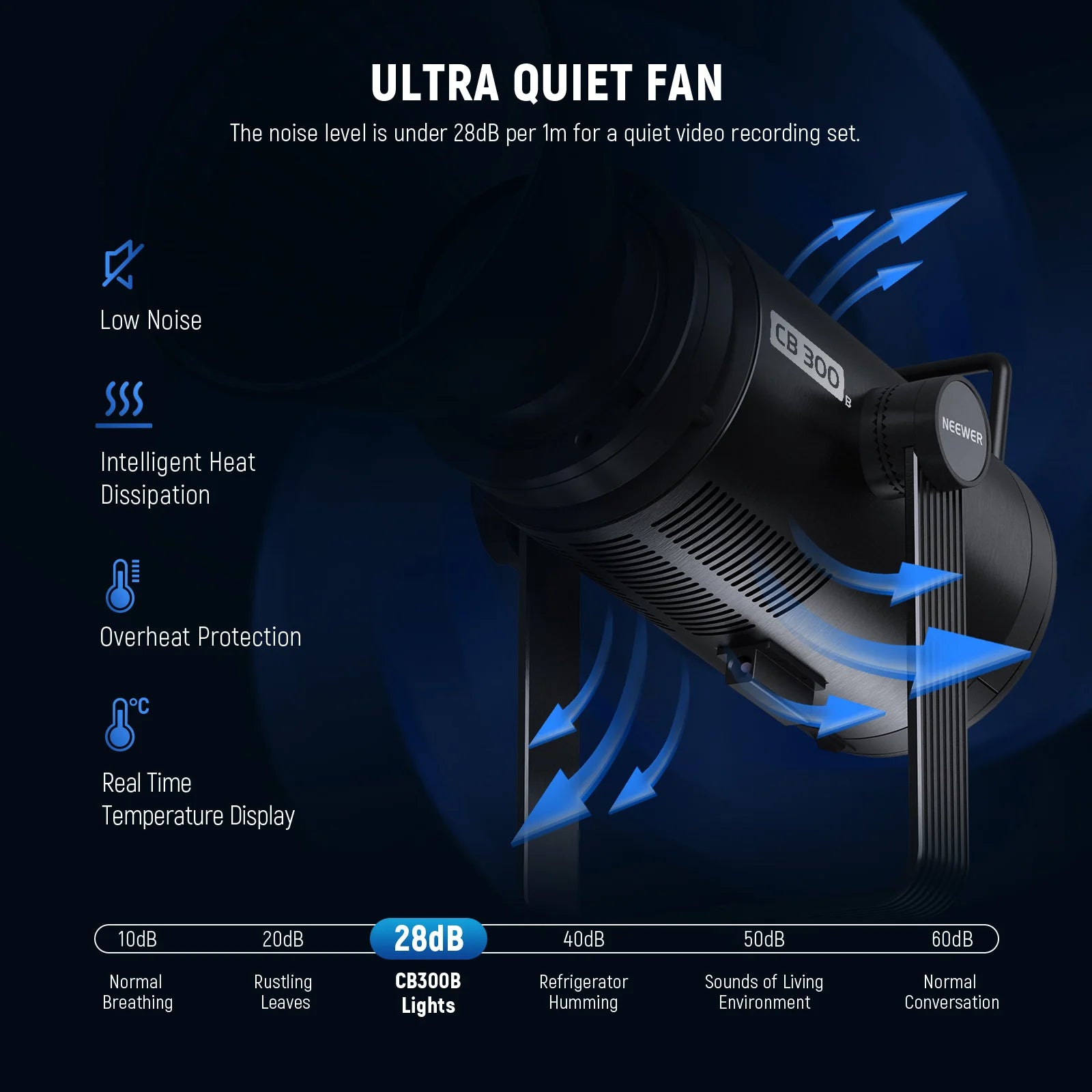 - Efficient Overheating Protection- The integrated ultra silent cooling fan and upgraded heat dissipation system keeps the noise level under 28dB within 3.3ft/1m and provides content creators a silent environment for shooting. The LCD screen displays the real time temperature of the light body, and the automatic overheating protection can effectively prolong the product’s lifespan