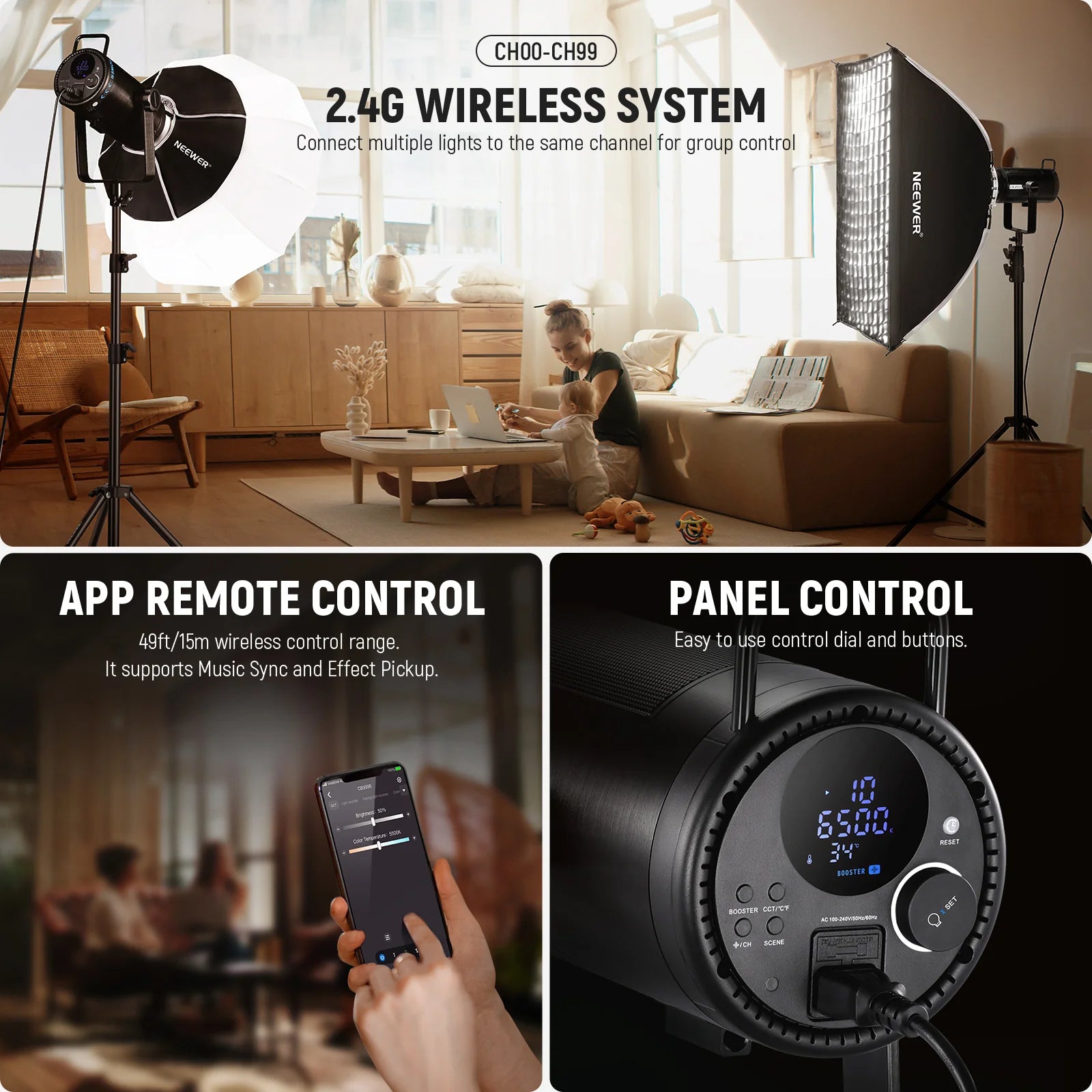 - APP/2.4G/Onboard Control- Use the NEEWER APP for group light control, OTA firmware update, light effect pickup, Music Sync, and other features. The built in 2.4G system offers CH00-99 channels. When multiple lights are set in the same channel within 49ft/15m, you can make synchronized changes by changing the settings on any one of them (currently available for NEEWER CB100C, CB200B, FS150B, FS150, MS60C, MC60B, MS150B, BH30S, and CB60B). The physical onboard buttons are also easy to use