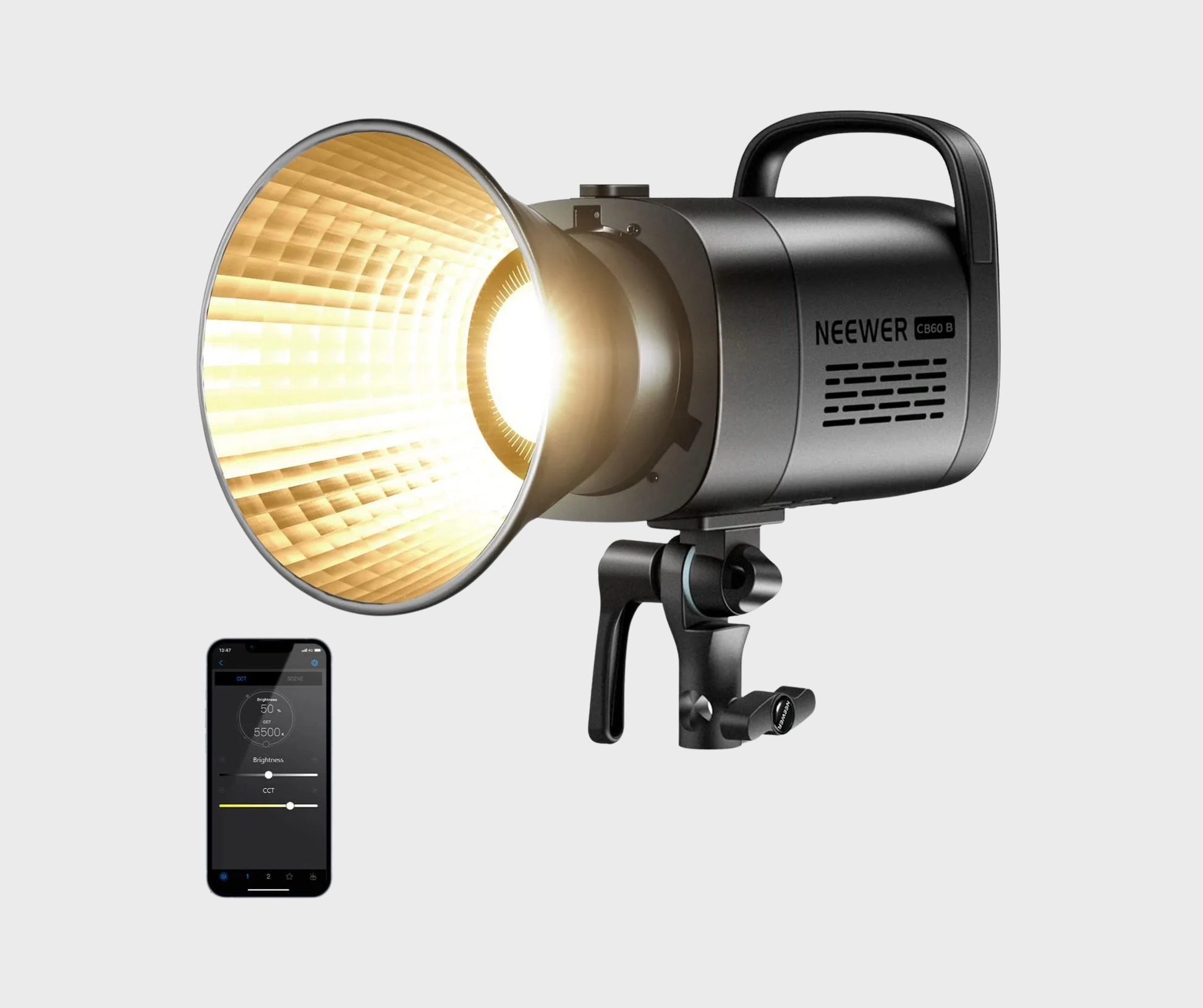 The NEEWER CB60B is a compact yet powerful 70W bi-color COB video light delivering up to 34,000 lux at 1m, with flicker-free output, adjustable 2700K–6500K CCT, smooth 0–100% dimming, and CRI 97+/TLCI 98+ accuracy—ideal as a key or fill light for video, livestreaming, weddings, and content creation.
